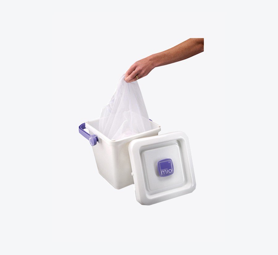 Prikvačite vrećicu za pelene (vrećica se kupuje zasebno) s unutarnje strane koša. Poklopac koji se zatvara spojnicama sa strane sprječava neugodne mirise. Zapremina: 14 litara